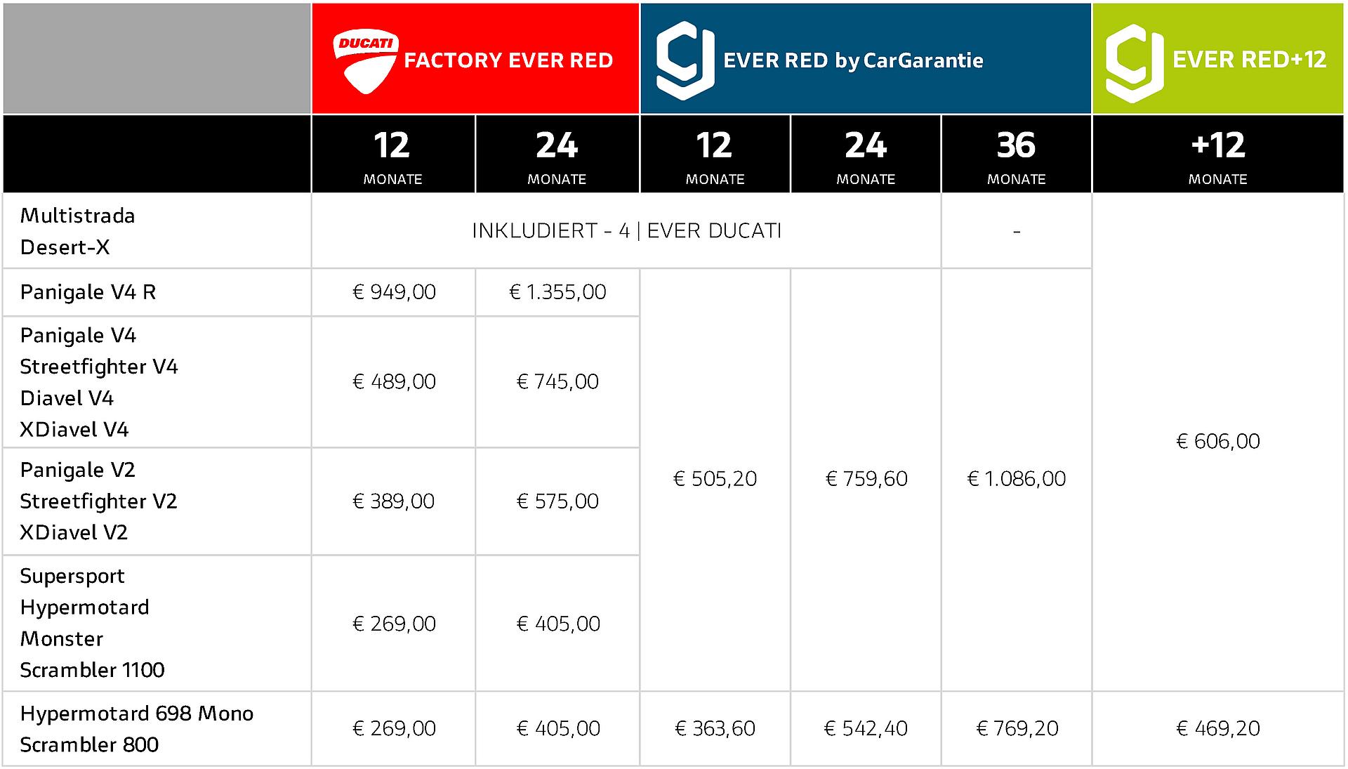 Die Preisempfehlungen für Ever Red variieren je nach Motorradmodell, Deckungsdauer und Produkt. Die Preise für den österreichischen Markt sind nachstehender Tabelle zu entnehmen und verstehen sich einschließlich der gesetzlichen Mehrwertsteuer von 20%.